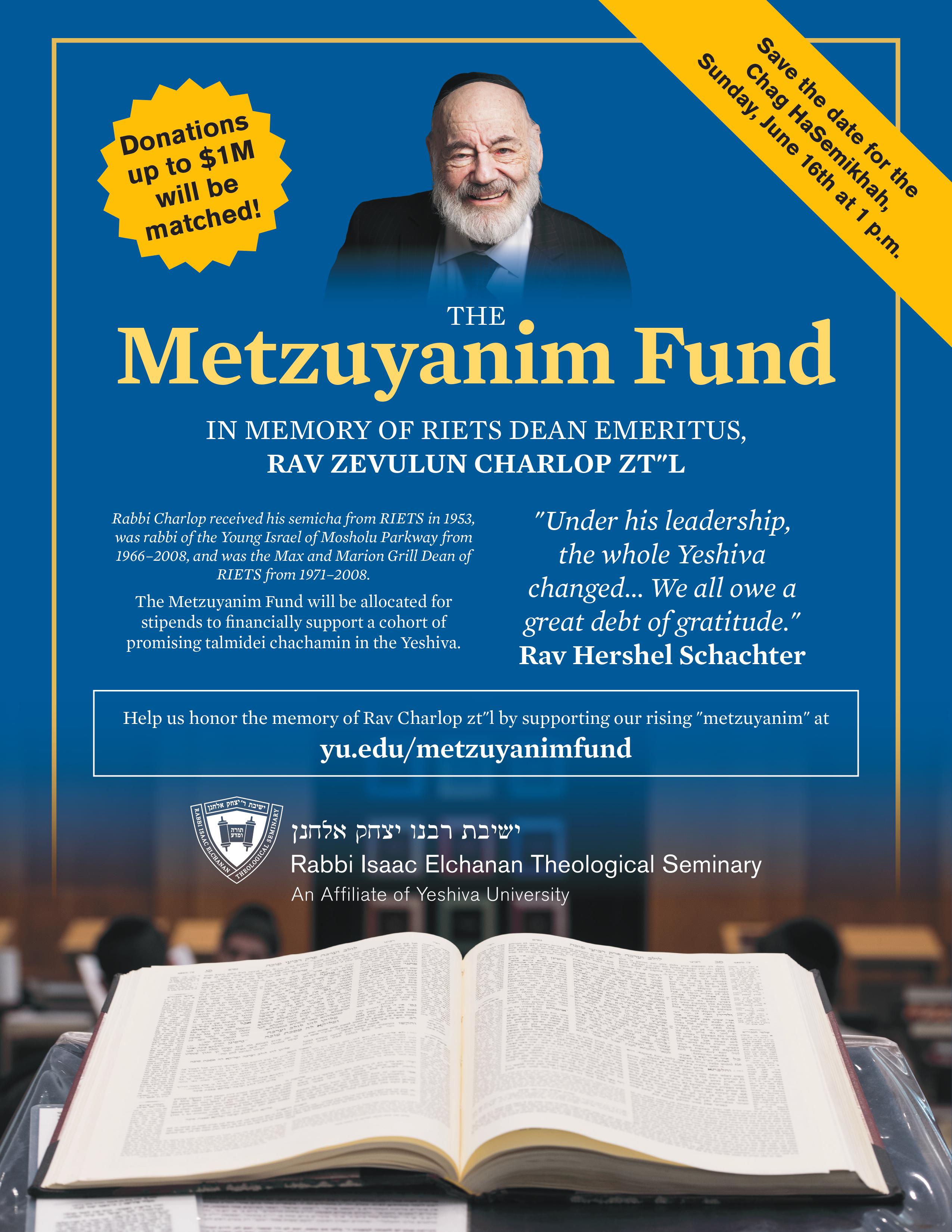 Our Dean Emeritus, Rabbi Zevulun Charlop Zt"l, was a pillar of the RIETS community for decades and aided countless talmidim (or, as he would say, "metzuyanim") on their path to becoming rabbanim. As we prepare to celebrate the Chag HaSemikhah, we are privileged to establish the Metzuyanim Fund in his memory to financially support a yearly cohort of promising talmidei chachamim learning in our kollel. Thanks to a generous donor, contributions will be matched up to $1 million! Please consider supporting our rising metzuyanim in order to continue the tradition of excellence and success in learning that Rabbi Charlop embodied. Donations can be made at https://es.uzh1w.shop/MetzuyanimFund